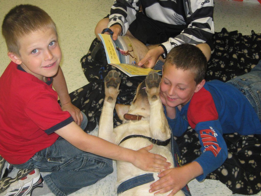 This is a Reading Buddy Program. The bond between the canine and the children builds confidence and supports learning to read. You can see there is a great deal of joy happening.